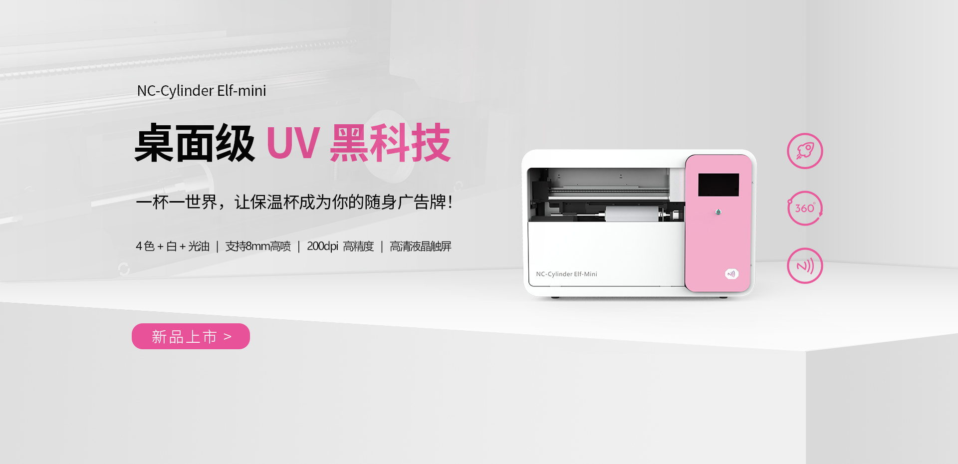 可加裝電動圓柱體治具,實現(xiàn)360度旋轉(zhuǎn)打印,馬克杯,保溫杯等柱形產(chǎn)品均可打印,滿足多樣化的定制需求。